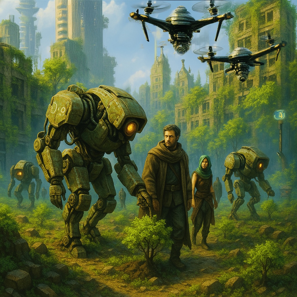 The Naturas repurpose drones salvaged from NeuroCorp and Iron Alley. But instead of patrol or enforcement, their drones pollinate, plant, and monitor ecosystem health. They hum softly through the trees—painted with moss, their sharp lines dulled. Some even follow residents, acting as memory keepers and personal assistants.