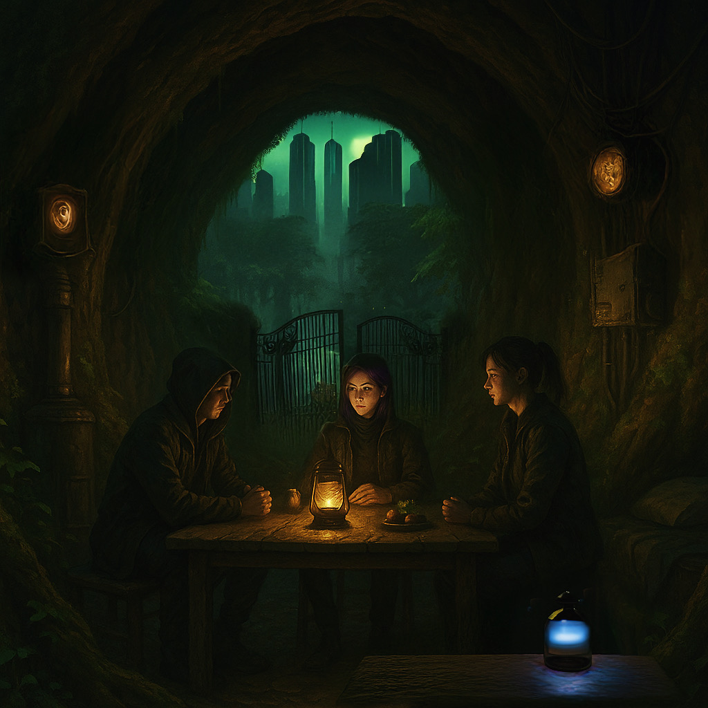 The hideout wasn’t a building, not in the traditional sense. It was a massive hollowed-out tree, grown around the rusted skeleton of an old telecom tower. Someone had once lived here—cables ran like veins through the wood, and a small generator hummed just beneath a floor covered in thick leaves. A narrow slit in the bark offered a view of the forest canopy and, far off, the faint glow of the city skyline.