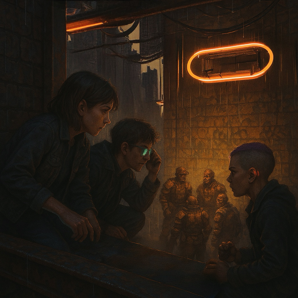 The three huddled under the cover of the platform, the city’s neon glow dripping down the rain-slick streets. In the distance, a guttural laugh echoed from a nearby alley. Mira pulled Rika and Kaio into the shadows, pressing them against the cold wall.