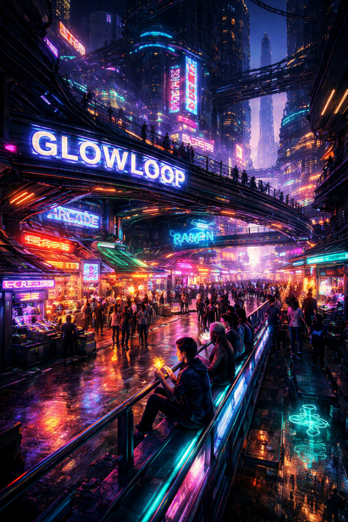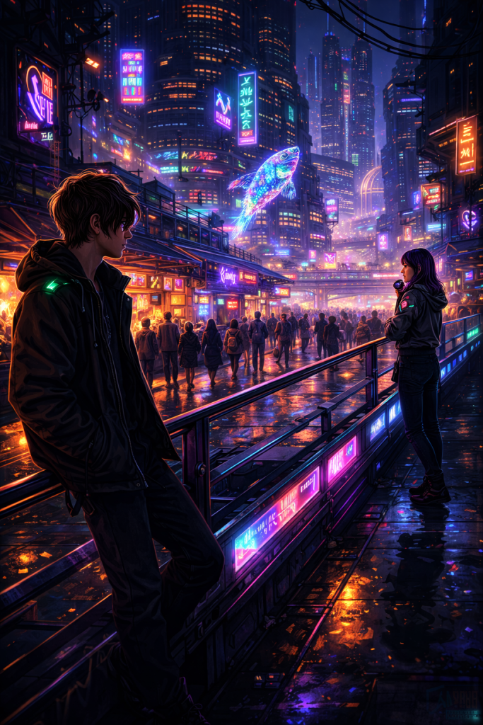 They met in Neon Labyrinth, where the alleys were narrow and bright with illegal tech stalls and noodle steam mixing with ozone.