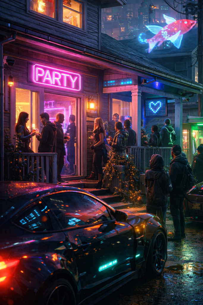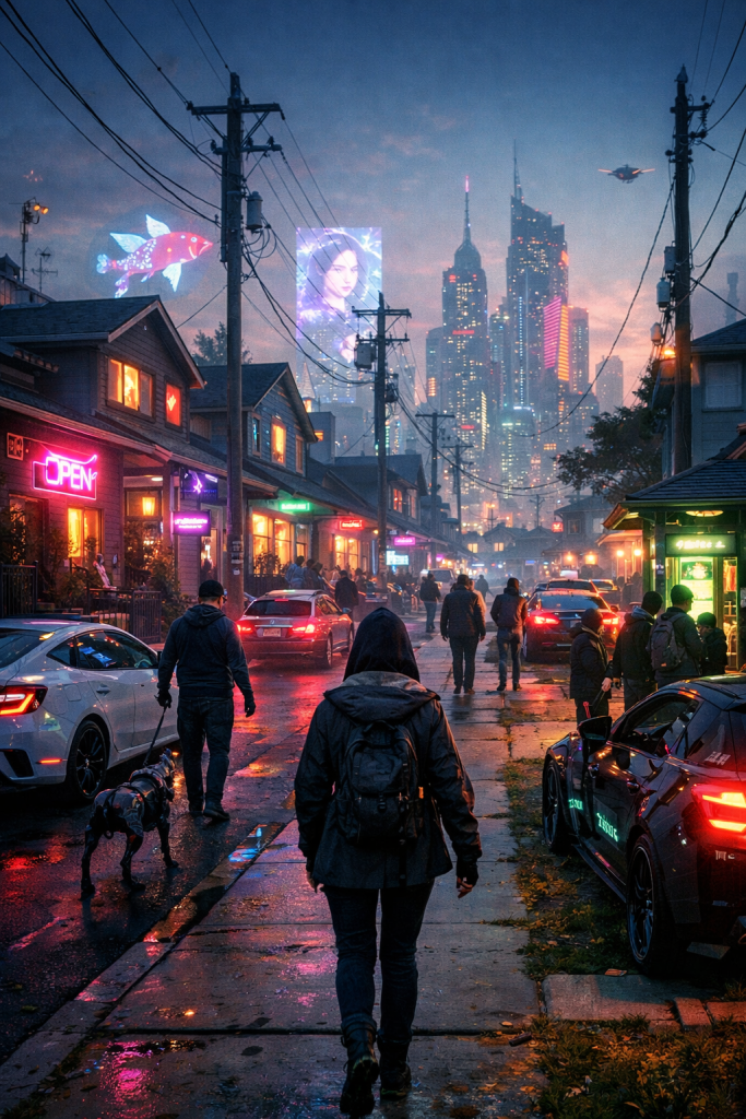 He waited outside the sterile white tower while neon advertisements shimmered across the glass. Rain pooled at his boots. He rehearsed what he would say when she came out. He would take her away from here. They would leave the city. Find some edge district where implants were rare and the stars were still visible without augmented overlays.
