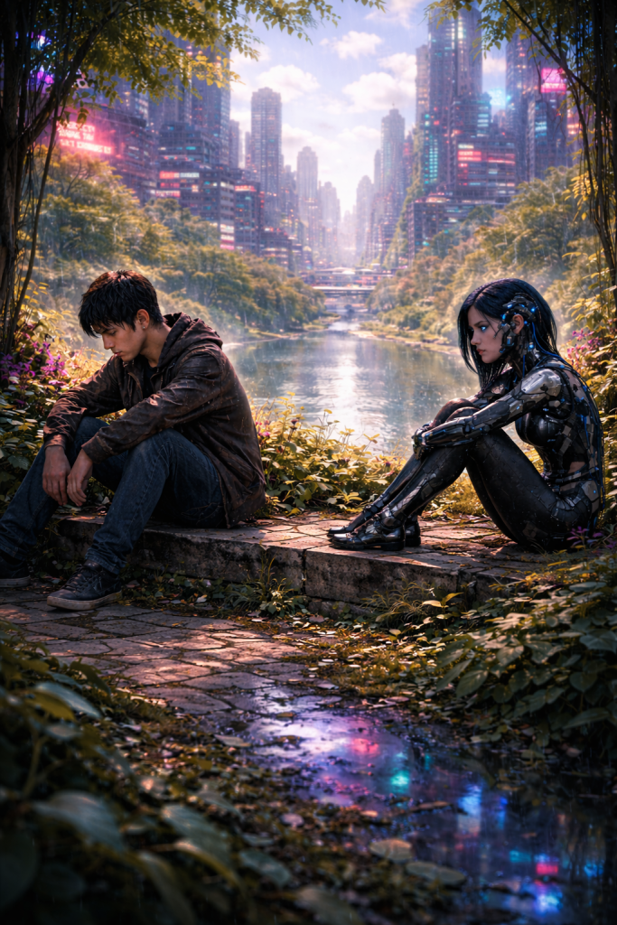 They spent evenings sitting above the city in a crumbling apartment overlooking the glow of Neon Spire, watching delivery drones drift like slow stars. She would rest her head on his shoulder, her breathing steady, and he would pretend nothing was changing.